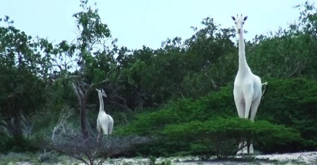 Nel Ishaqbini Hirola Conservacy, a Garissa (Kenya), vivono molte specie in via d'estinzione. Ma un abitante della zona è riuscito a riprendere due esemplari più unici che rari: due giraffe completamente bianche, una madre con il piccolo.