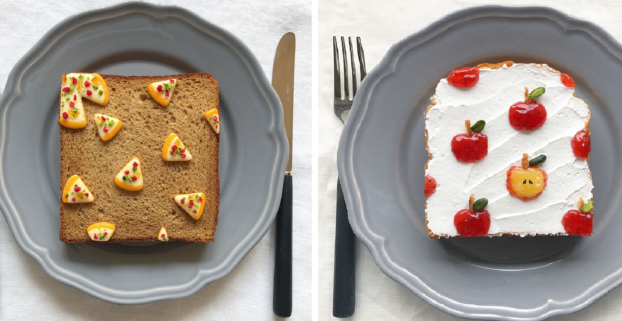Eiko Mori è un'artista giapponese del cibo, che sta realizzando delle piccole opere d'arte culinarie. Utilizza una fetta di shoku pan, il pane giapponese morbido e soffice, come base per dei toast.