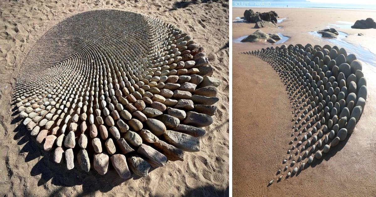 L'artista gallese Jon Foreman realizza delle straordinarie land art disponendo con cura pietre e conghiglie per generare ipnotici gradienti che si dispiegano sulla sabbia.