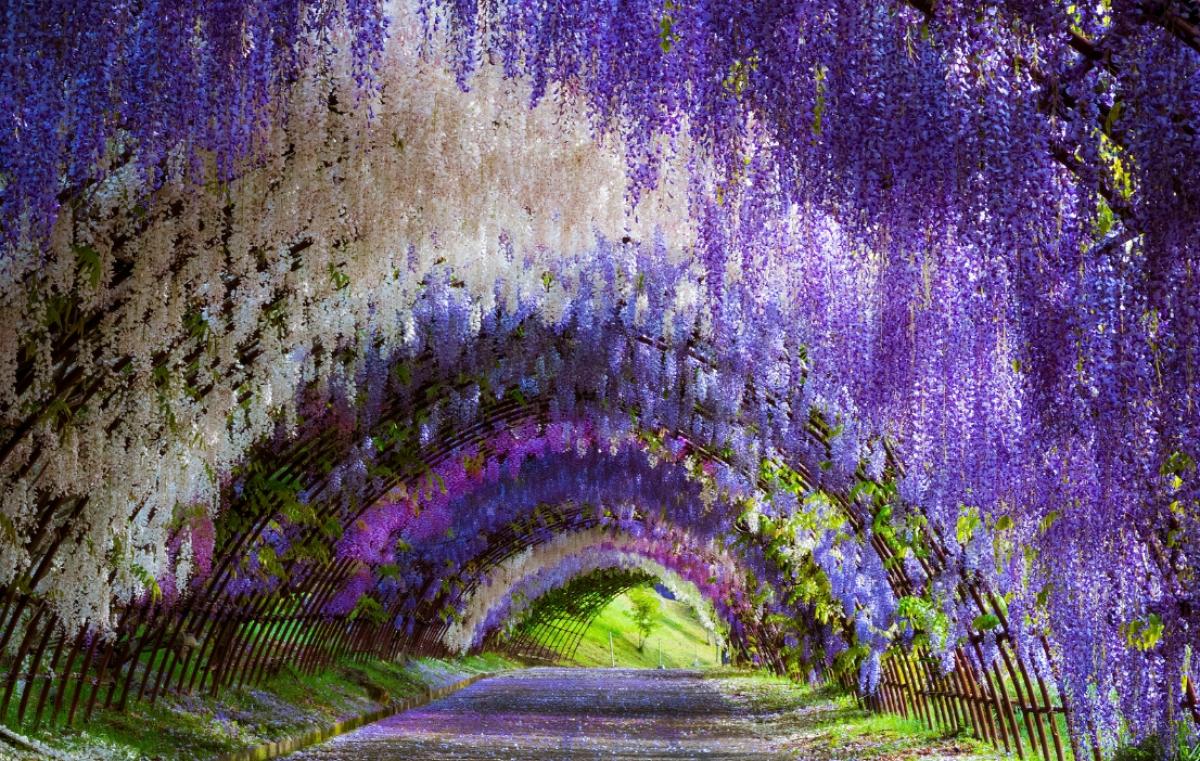 Il Giappone è conosciuto per i suoi bellissimi ciliegi in fiore, che in primavera rendono il paese una meraviglia unica al mondo. Ma i glicini, con le loro liane cadenti, non sono da meno, e contribuiscono a rendere i paesaggi del Giappone assolutamente fiabeschi.