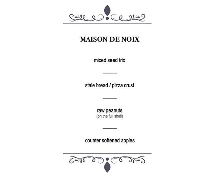 Maison du Noix (un elegante nome francese che significa "La Casa delle Noci"). I piatti serviti sono noccioline, semi e mele. Gli scoiattoli e le ghiandaie lo amano, e alcuni esemplari sono già frequentatori abituali. Ma anche gli umani apprezzato: tutti quanti si fermano per fare foto o ammirare gli animaletti.