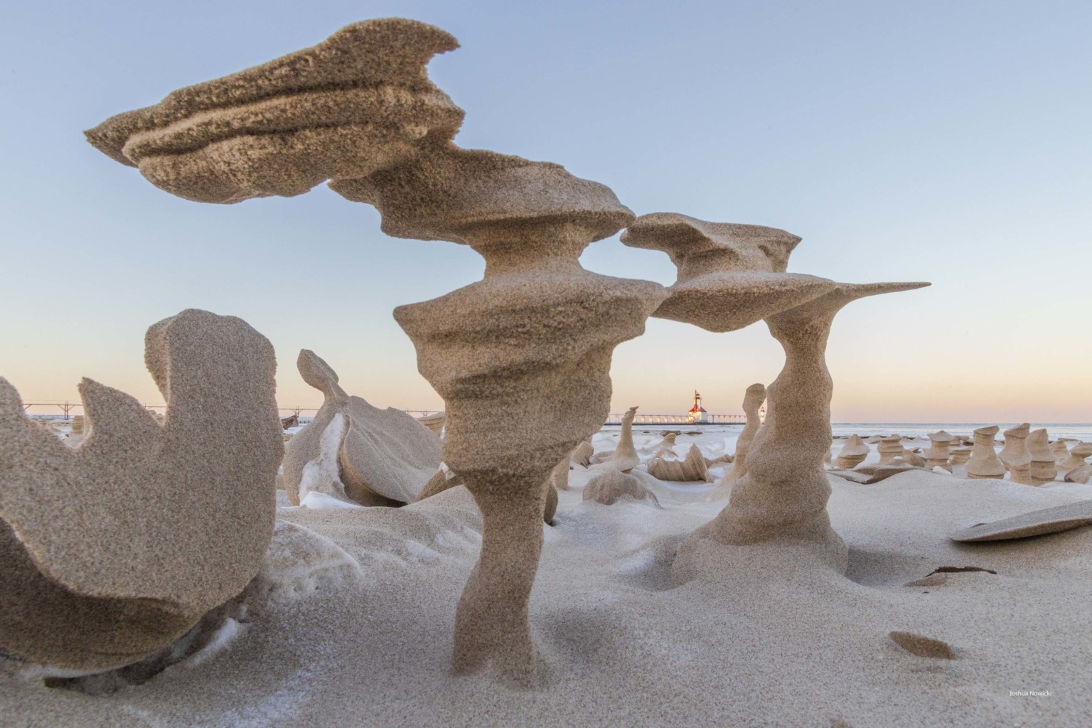 Mentre esplorava la costa del lago Michigan, il fotografo Joshua Nowicki si è imbattuto in un fenomeno naturale unico: delle formazioni sabbiose temporanee che assomigliano a strutture rocciose note anche come camini delle fate.
