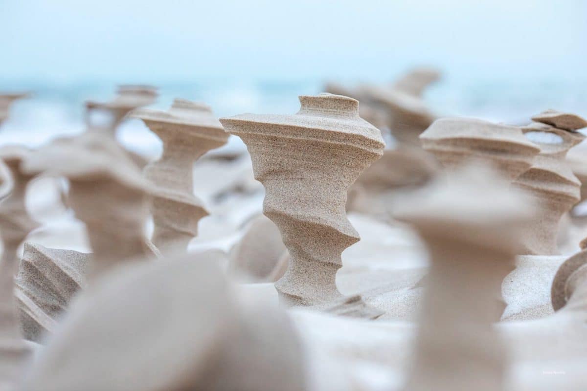 Le strutture di sabbia che vedete in queste foto sono tra le più grandi che Nowicki abbia mai fotografato: la più alta arriva a superare i 38 centimetri. "Per fotografarli, mi sono sdraiato sulla spiaggia e ho usato un obiettivo da 20 mm o un obiettivo da 135 mm", racconta il fotografo. "Non durano molto (di solito solo un paio di giorni), il vento li erode completamente o li abbatte. Se la temperatura sale sopra lo zero, si sbriciolano; e spesso in inverno vengono presto ricoperti da neve."